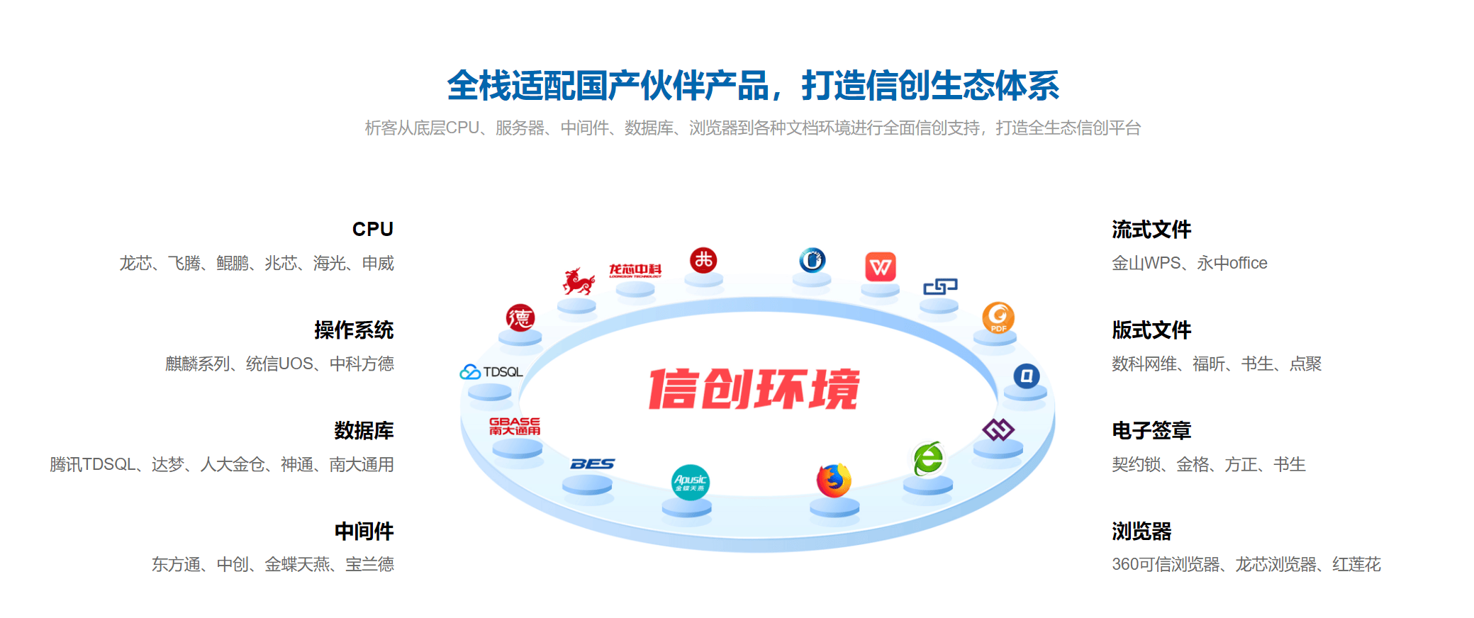 兼容国内各种主流软硬件厂商产品,打造全生态信创平台。
