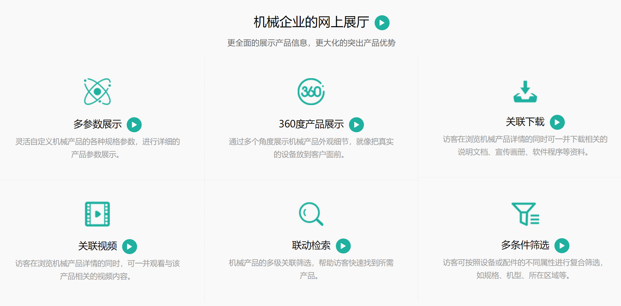 产品展示功能:机械企业网站要重点展示企业的产品信息,包括产品型号、规格、参数、使用范围等详细描述,并通过图片、视频等多种方式进行呈现,方便潜在客户了解企业的产品。